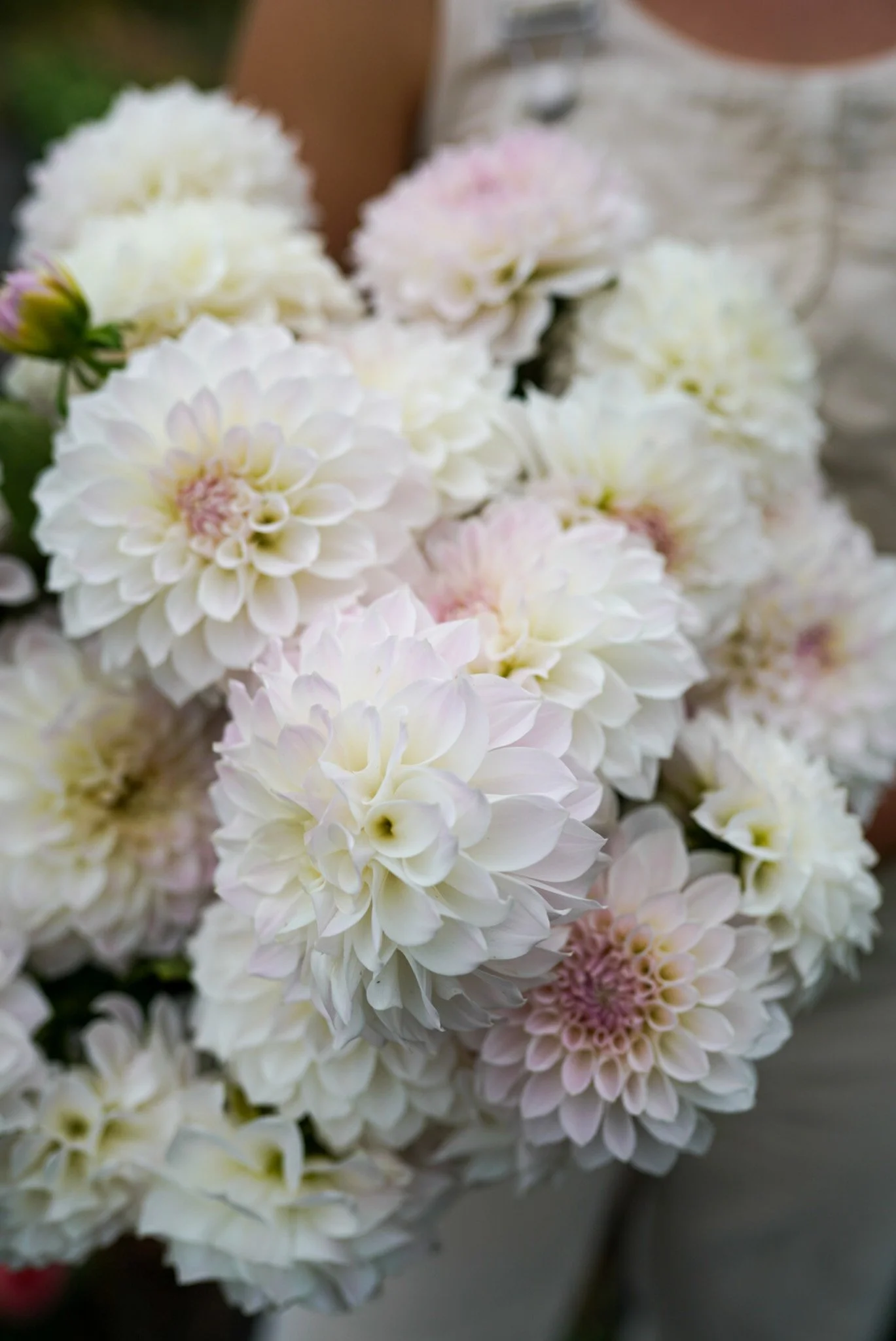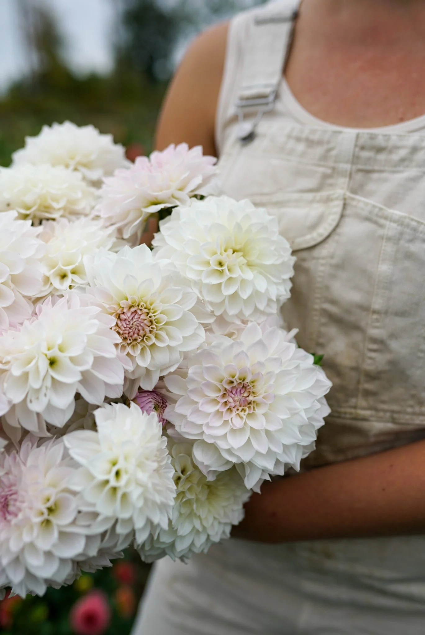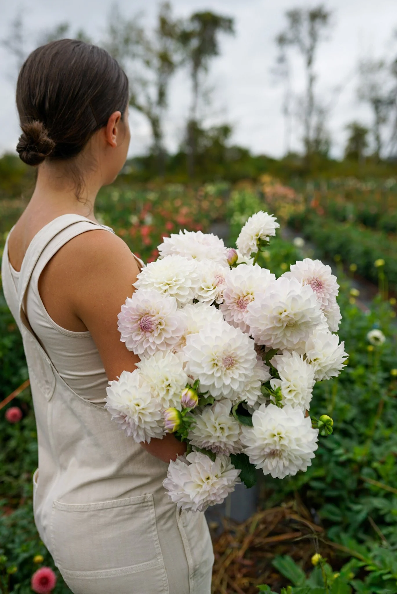 Rose Toscano is a lovely, rich salmon meets peach ball dahlia, slightly smaller in bloom size. This variety produces a good amount and is a hard-to-find color. Commonly known on our farm as “my buddy Rose” (the back story is she was memorable during Dahlia Tuber season for making the cutest, most perfect Dahlia tubers that stored perfectly). A must-have!!
