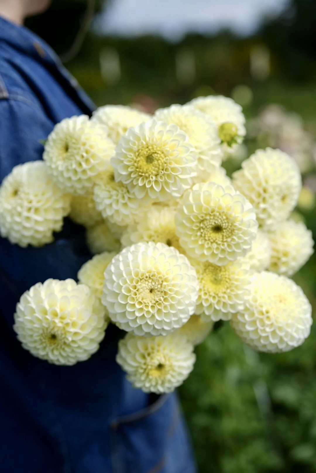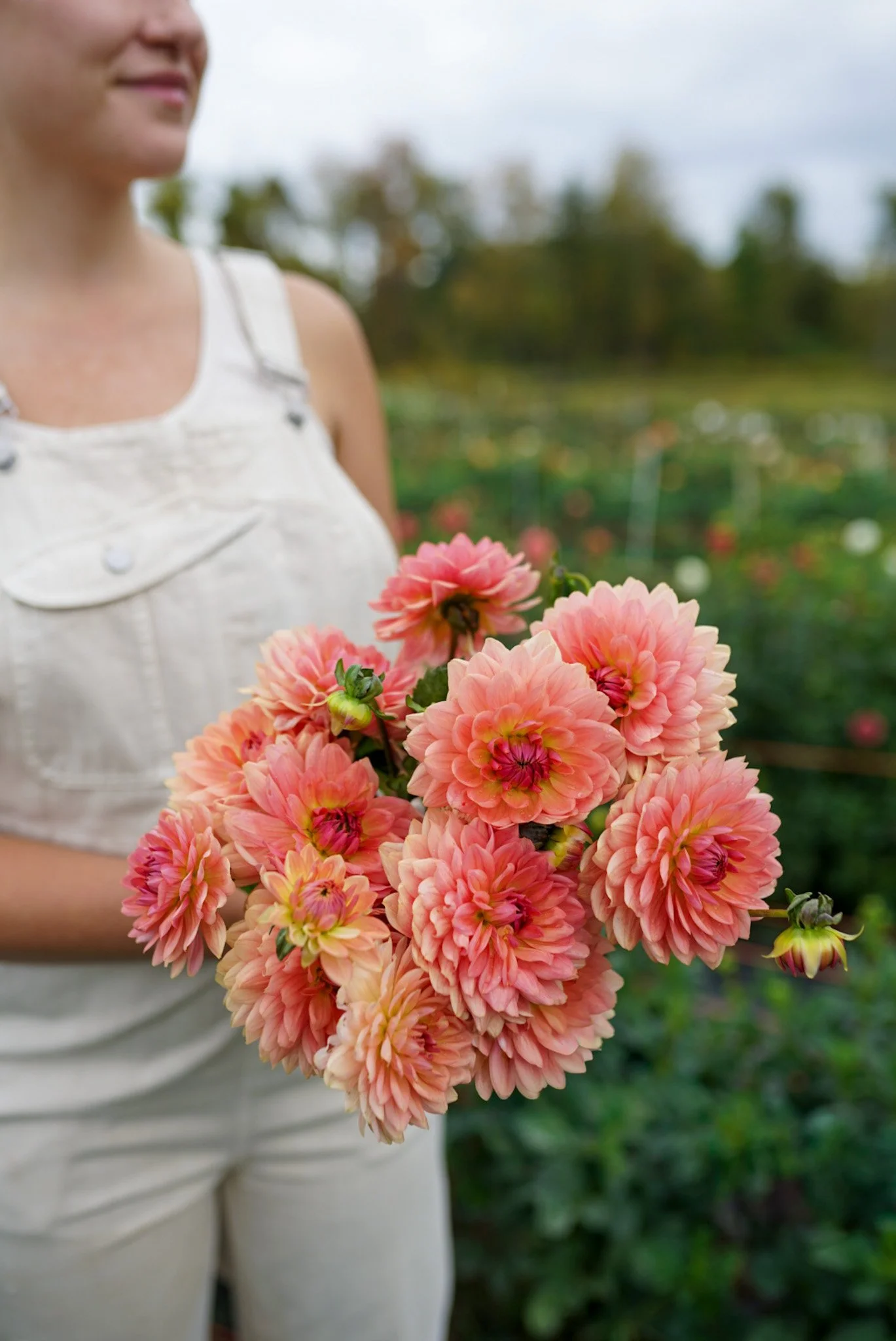 Rose Toscano is a lovely, rich salmon meets peach ball dahlia, slightly smaller in bloom size. This variety produces a good amount and is a hard-to-find color. Commonly known on our farm as “my buddy Rose” (the back story is she was memorable during Dahlia Tuber season for making the cutest, most perfect Dahlia tubers that stored perfectly). A must-have!!